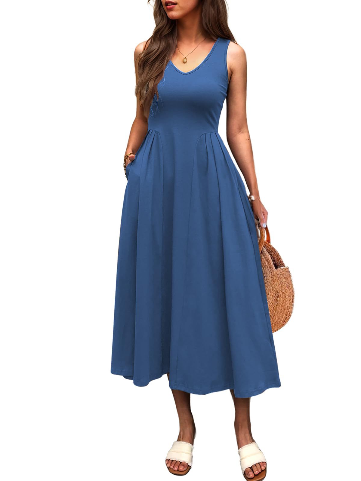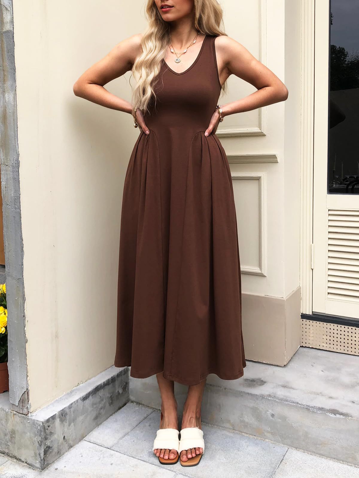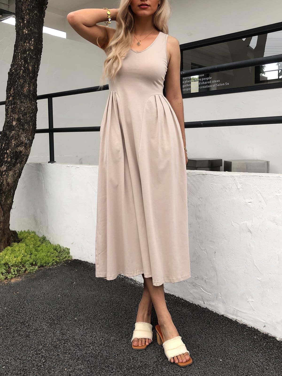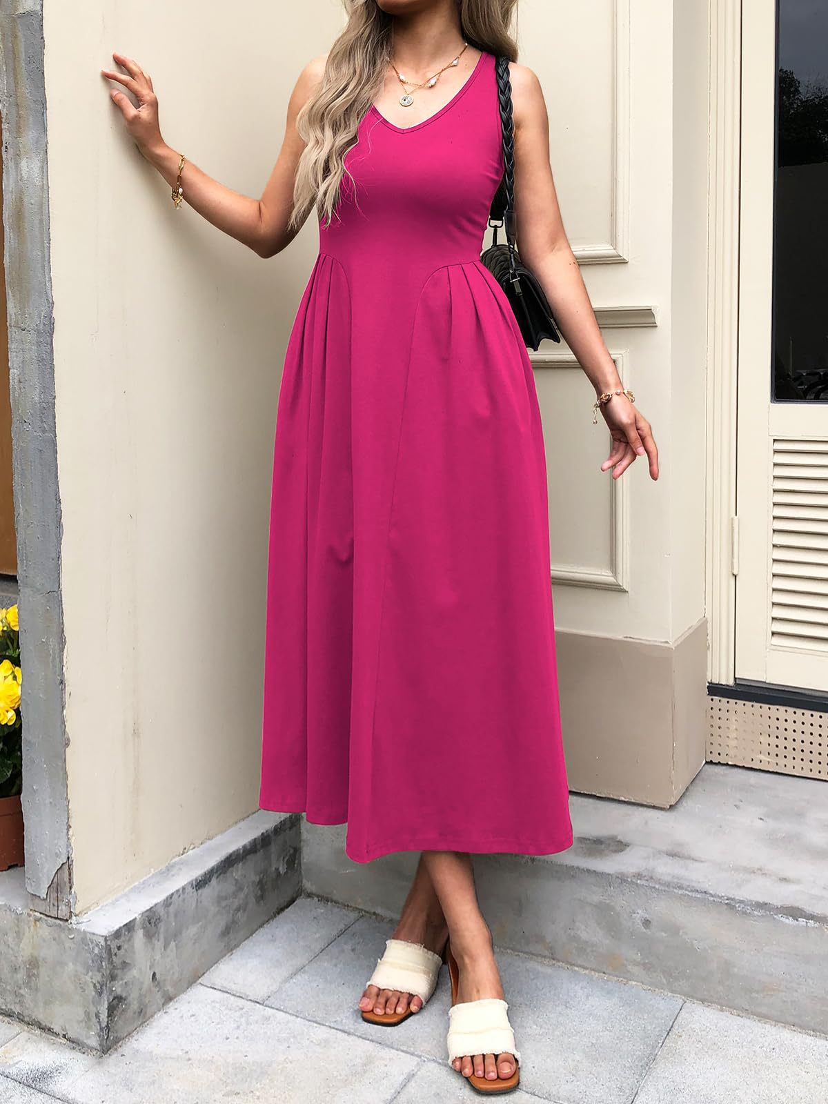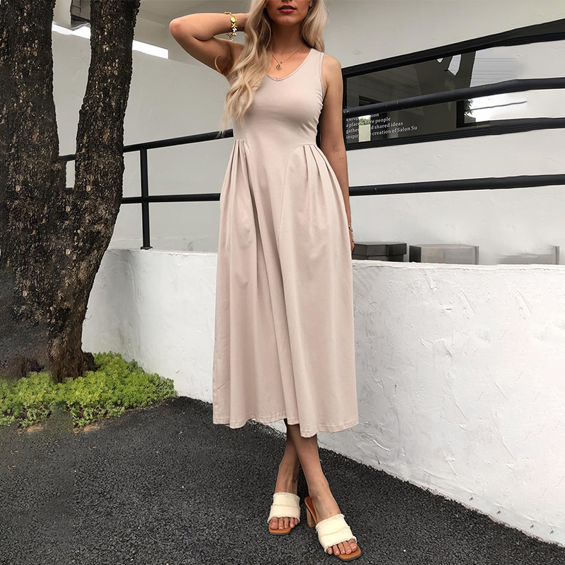 Elegant High-Waisted Pleated Pocket Long Sleeveless Dress in Solid Color for Spring and Summer